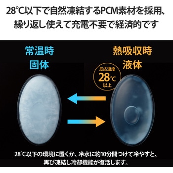 28℃以下で自然凍結するPCM素材を採用しています。溶けて液体になった場合は、28℃以下の環境に置くか、冷水に約10分間つけて冷やすと、再び凍結し冷却機能が復活します。繰り返し使えて充電が不要なので経済的です。
