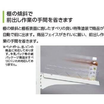 棚の傾斜と棚板表面に施したすべりの良い特殊塗装で商品が自動で前に出ます。商品フェイスがきれいに揃い、前出し作業の手間を省きます。