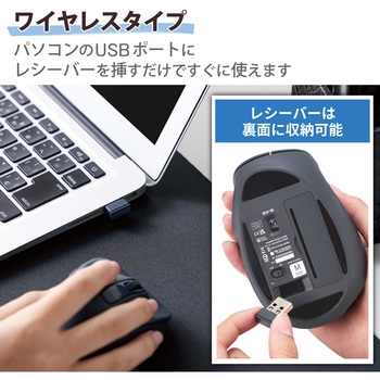 パソコンのUSBポートにレシーバーを挿すだけで、すぐに使用できるワイヤレスタイプです。