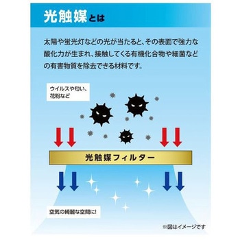 エアコンの吸気口にフィルターをつけるだけ!エアコンが室内の空気を吸い込む際に、フィルター表面の光触媒が空気をろ過し、浮遊ウイルス・雑菌・嫌な臭いなどを分解・除去します。
