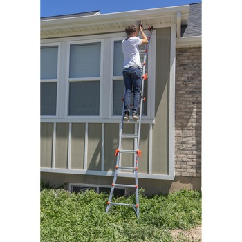 この1台で「脚立」「長尺脚立」「伸縮脚立」「伸縮はしご」と多様な使い方ができ便利!キャスター付で移動も便利にラクラク。(LG-15413にはキャスター無し)壁画での作業に便利な90°ポジション。幅広踏ざんで昇降時、足の負担を軽減。