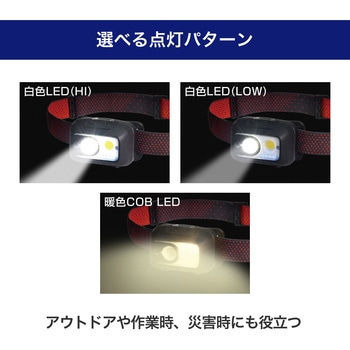 付属品ヘッドバンド質量(g)約95(ヘッドバンド、電池除く)角度(°)ヘッド部可動:約60保護等級IPX4(防沫形)外形寸法(幅W×高さH×奥行D)(mm)約78×51×48(最大値)光源白色LED×1灯 暖色COB LED×1灯使用電池単四形アルカリ乾電池×3本(別売)連続点灯時間白色LED(HI)約5時間、白色LED(LOW)約11時間、暖色COB LED 約10時間(※アルカリ乾電池使用時※電池の性能、使用条件により連続点灯時間は短くなる場合があります)明るさ(Lm)白色LED(HI)230、白色LED(LOW)60、暖色COB LED 110(※アルカリ乾電池初期時)電球の種類LED内容量1個