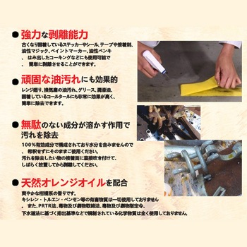 成分天然オレンジオイル・高精製ミネラルオイル・アロエベラ・ラノリン・非イオン界面活性剤※キシレン・トルエン・ベンゼン等の有害物質は一切使っていません。セット内容トリガー付き1本、付替えボトル5本使用方法(1)タール、油汚れ等通常の汚れは吹きかけてからしばらくしたら布等で除去して下さい。(2)シーリング剤等の強力なものは吹きかけてからしばらく放置してからはがして下さい。(放置時間は汚れの種類・経過時間・下地等の諸条件で違います。)汚れ除去後は水拭きして下さい。タイプスプレータイプシリーズプロ仕様の剥離剤シリーズ内容量(mL)375主な用途グリース・潤滑油・床接着剤等接着剤一般・ウレタンフォーム・シーリング剤(シリコン系、アクリルウレタン系、ブチル系等)・水中ボンド・ウェットペンキ・松ヤニ等の樹液・アスファルト・タール・血液(鮮血)・ラッカー(乾いていないもの)・ダクトテープ等のテープ・油汚れ(焼き付き、日焼け、シミ等の一部の汚れに対しては効果がありません。)入数6本(本体×1・詰替え用ボトル×5)内容量1ケース(375mL×6本)