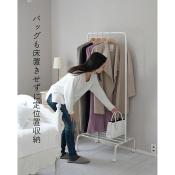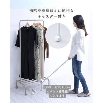 シンプルですっきりな外観のハンガーラック。細身ながらしっかりしたつくり。服の下にモノが置ける棚付き。掃除や模様替えもしやすいキャスター付き。お部屋になじむ、ツヤのないマットな質感。バーには滑り落ち防止の突起付き。