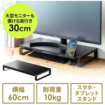 モニタ下の空間を収納スペースにできるモニター台です。モニタの高さを上げる事で目線を高くして作業時の姿勢の改善に役立ちます。前面に引出タイプのスタンドが付いているのスマートフォンやタブレットのスタンドとしてお使い頂けます。奥行300mmで台座の大きなモニタも設置できます