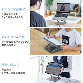 ヒンジ構造により無段階で自由に角度と高さを調整することができるので、使用環境に合わせて最適な角度で使用できます。
