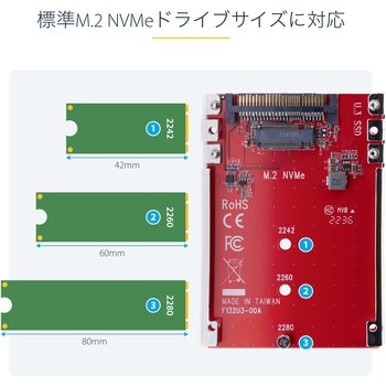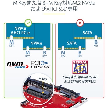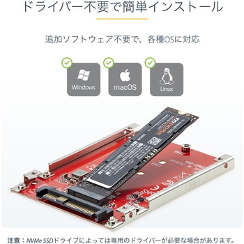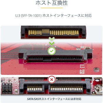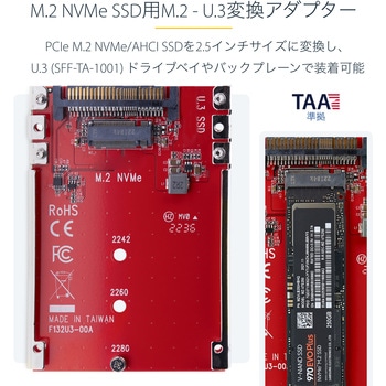 PCIe M.2 SSD - 2.5インチU.3変換アダプター:PCIe M.2 NVMe/AHCI SSDを2.5インチフォームファクタに変換し、U.3ドライブベイ/バックプレーンに取り付けが可能。U.3(SFF-TA-1001)ホストインターフェイスに対応。TAA準拠