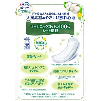 天然素材の触れ心地●オーガニックコットン100%※1シート搭載。●汗や湿気さえも吸収し、ムレを軽減。●無添加シート搭載※2。●ニオイを閉じ込める消臭ポリマー※3配合。●横モレを防ぐ立体ギャザー。●幅広ズレ止めテープでモレ安心。<以下注釈>※1肌が触れる面の上層に100%オーガニックコットンを使用しています。※2肌に触れる面は石油由来油剤無添加仕様のシート。※3アンモニアについての消臭効果が見られます。吸収量 長さ少量用 20cc 19cm快適の中量用 45cc 23cm安心の中量用 80cc 23cm多い時でも安心用 120cc 29cm医療費控除対象品