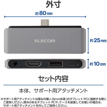 付属品サポート用アタッチメント色シルバー備考※各OSの最新バージョンへのアップデートや、サービスパックのインストールが必要になる場合があります。対応OSWindows 11/Windows 10外形寸法(幅W×奥行D×高さH)(mm)約80×25×10 ※突起部分含まず動作環境温度5~40℃、湿度30~80% ※結露なきこと保証期間1年間電源供給方式バスパワーUSBポート数【ダウンストリーム】1:USB Type-C(TM)ポート×1<最大出力55W> ※充電専用USB Power Deliveryポート、【ダウンストリーム】2:USB-Aポート<USB2.0・供給電力値:2.5W(5V>×1コネクタ仕様【アップストリーム】USB Type-C(TM)プラグ<USB>、USB Power Delivery対応(最大入力60W/最大出力55W)、DisplayPort(TM) Alt mode (USB2.0接続時は、USB2.0互換で動作(USB2.0時は、映像出力非対応))ポート【映像出力/ダウンストリーム】HDMIポート×1<対応解像度:最大4K/60Hz>、【音声/ダウンストリーム】3.5mm 4極ステレオミニポート(CTIA方式)内容量1個