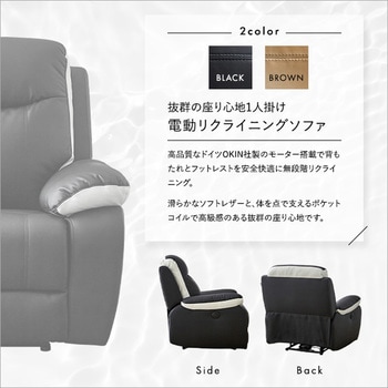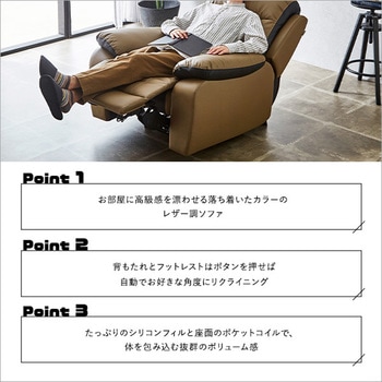 座り心地抜群!1人掛け電動リクライニングソファ!2色からお選びいただけます。ドイツのOKIN社製のモーターをしており、安全な無段階リクライニングで快適に過ごせます。ひじ掛け横のボタンで、フットレストと背もたれをリクライニングすることができます。高級感のあるソフトレザーの張地がお部屋に高級感をもたらします。