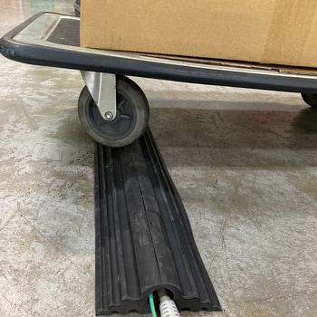 工場内や道路でのコード保護に最適なコードプロテクターです。ゴム製に比べて、耐久性、耐摩耗性、引裂強度が高くなっており、また重量は軽くなっています。耐久性については、約2tの普通自動車の乗り上げ試験にクリアしています。プラスチック製のため、ゴム臭がなく設置面への色移りもないほか、廃棄後も再利用が可能です。素材がやわらかいので巻き癖が少なく、コードの出し入れが簡単です。