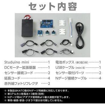 Studuino mini×1、DCモーター拡張基盤×1、センサー接続コード×2、延長コード×4、赤外線フォトリフレクタ×2、電池ボックス(単3型3本)×1、USBケーブル(miniB)×1、センサー取付パーツ×2、Nゲージ接続ケーブル×1