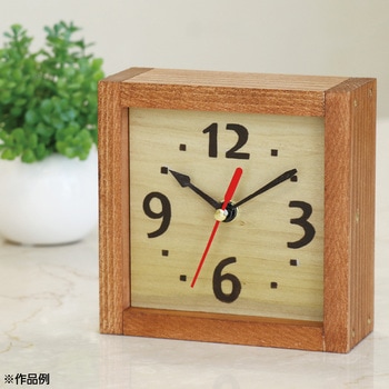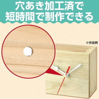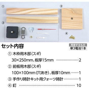 木工短時間教材(15×30×250mm)×2、木工短時間教材(10cm角穴あき)×1、手作り時計キット用クォーツ時計×1、釘×10