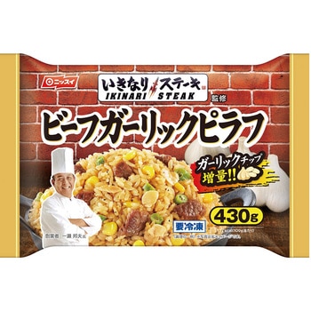 ステーキ専門店「いきなり!ステーキ」監修のビーフガーリックピラフです。秘伝のソースで仕上げることで本格的な味が楽しめます。時間が無い時でも電子レンジで簡単に調理可能です。工区内工場で製造しております。コーン、いんげん、牛肉の具材入り。こってりとしたものが食べたいときにおすすめな商品です。