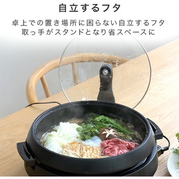 焼き物も鍋物もコレ1台。蓋が立てられる着脱式電気グリル鍋。シーズヒーター採用。プレートは着脱式で丸洗い可能。プレートはフッ素樹脂加工でお手入れラクラク。ガラスふた付。