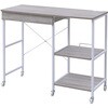 ゴミ箱上を活用する、しっかり頑丈なキッチンラック。蓋付きゴミ箱も収納可能なサイズ設計。天板にはホコリ防止カバー付きコンセントが付属(2口合計1500Wまで)。水にも強いPVCで、作業台としても活躍。引出しはレール付きで、開け閉めラクラク。キャスター&脚長で、日ごろのお掃除もしやすい設計。動かしやすい単輪キャスター4個(うちストッパー付き2個)。