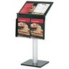 シルバーと黒のコントラストが高級感を演出します。太い柱がしっかりと表示面を支えるスペックスタンド。高級感があるのにコストパフォーマンスに優れた製品。頻繁に情報を変えたい方にオススメ。面板と柱の固定にΦ80のキャップを使用しています。350角の四角ベースは、ツヤ消しブラックで高級感があります。面板部はPOPIC No.10-N-12で固定されており、簡単に表示内容を変更して頂けます。