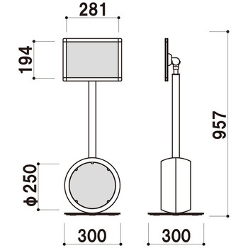 スタンド土台の円形部分にサイン装飾や案内表示ができます。ワンポイントのアクセントが可愛らしいメニュースタンドです。丸型面板付き!かわいいフォルムで1台2役、案内表示とメニュースタンド。丸型面板にプラスアルファの案内が可能。1.ポスター交換。印刷物を付属のスチレンボードと透明板の間に挟み、パネル上部の溝より、スライドして交換します。2.面板部角度調整可能。0°・20°・40°・60°・90°に固定可能です。3.面板取り外し。丸型面板にある切り欠き部分をツメの位置まで移動させ、斜め上にスライドさせてサイン部分を取り外します。