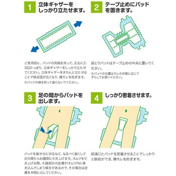 用途紙おむつ用尿取りパッド、病院・介護施設向け。材質表面材:ポリオレフィン系不織布、吸水材:綿状パルプ/吸収紙/高分子吸収材、防水材:ポリエチレンフィルム、止着材:粘着テープ(合成ゴム系)、伸縮材:ポリウレタン、結合材:ホットメルト粘着材寸法(幅W×長さL)(cm)パッド:20×48