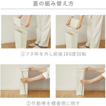 幅13.5cmで場所の取らない薄型設計。蓋に手を触れずにゴミが捨てられるペダル式。蓋の開閉方向を組み替え可能。