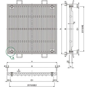 メインバーはノンスリップパターン。杖・ハイヒールのかかと・車イスのキャスターが落ちません(グレーチングのスキマは、5mm の細目ペデグレートです。)緊急車が通過しても割れません(材質はダクタイル鋳鉄を使用していますので消防車や救急車が通過しても割れません。)蓋仕様:イタズラ防止・盗難防止・ガタツキ防止に。特殊ナットは鋳物の色と同系の黒染です。 固定部は蓋表面のデザインを損なわないフラットな構造になっています。
