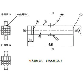 角型ですので、壁面タイルとの納まりがきれいです。外形寸法 □46mmですので、60mm幅タイル・5mm目地とした場合に12mmのシール幅が取れます。パラペット内側の網は、安全性に配慮した開口□7.5mmです外壁側の金網には水抜き用に切欠きがあります。