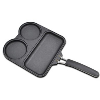 3つの仕切りのフライパン。3種類の違う料理が一度に作れて時間短縮。焦げ付きにくいフッ素樹脂塗膜加工。