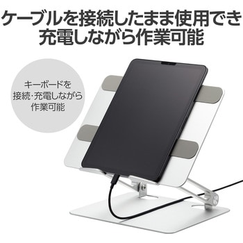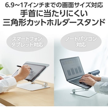 作業時にホルダーが手首に当たりにくい、スマートフォンやタブレット、ノートパソコン用の折りたたみ式スタンドです。