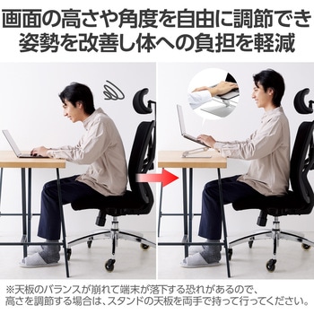 画面の高さや角度を自由に調節できるので、作業時の姿勢を改善し体への負担を軽減します。
