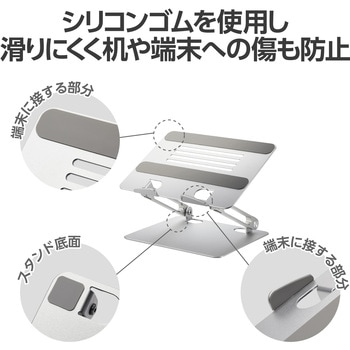 スタンド底面と端末に接する天板にはシリコンゴムを施しているので、滑りにくく机や端末への傷も防止します。