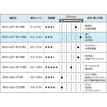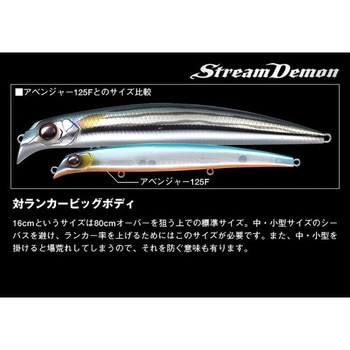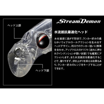用途ウォブルロールアクションで、モンスター狩りに鬼神の活躍。ランカー専用リップレスビッグミノー。 独特な風貌のヘッド形状は下部がワイドで上部が水流を適度に逃がすデザインで、モンスター好みの水をまとった柔らかいウォブルロールアクションを生み出します。 また、河川でのモンスター狩りに照準を合わし、アップクロスからのドリフトで流れに押された状態でも、潜りすぎず浮き上がらず、ランカー好みのレンジをトレース出来ます。 全長16cmの迫力のあるボディは80cmオーバーを狙う上での標準サイズ。中・小型のシーバスを掛けて場荒れすることを防ぎます。ここぞといった大きな流れの変化で食わせの間を演出。モンスターハンティングのためのモンスターミノー「ストリームデーモン」。タイプフローティング全長(cm)16自重(g)33.5リングサイズ【スナップ】<フックアイ>フロント:#4・センター:#4・リア:#4フックサイズフロント:#3・センター:#3・リア:#3潜行レンジ(m)0.2~0.4内容量1個
