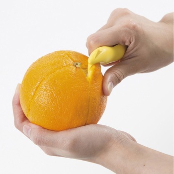 柑橘類の厚い外皮だけでなく、実の薄い皮まで簡単にカットできる、柑橘皮むきです。たくさん食べたいときやジャム作りで重宝します。外刃を柑橘の厚い表皮に直角にあて、4か所程切れ目を入れます。ヘラ部分を実と皮のすき間に入れて、親指ではさみ皮をむきます。取り出した房を内刃にあたるように滑らせると切れ目が入り、あとは手で簡単にむけます。食洗機可能なので、お手入れ簡単です。