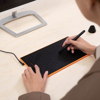 見やすいドットグリッドをプリントしたフルカバーパネルを採用、ワークスペース上で迷うことなくペンを使うことができます。パネルの表面を紙の質感に限りなく近づけることで従来のデジタルの概念を覆す自然で描き味を実現しています。