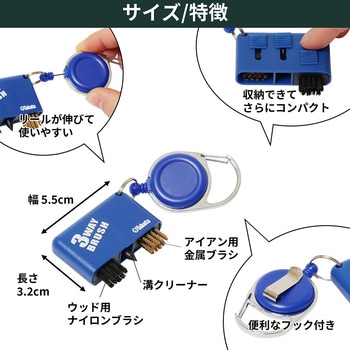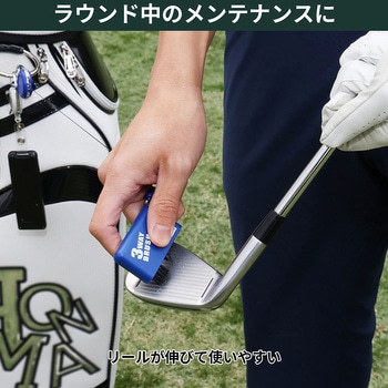 ブラシもクリーナーもこれ一つで解決!セルフプレイの強い味方、3wayブラシ。約60cm伸びるリールがついているのでキャディバッグやベルトに取り付けたまま使用可能。使い勝手抜群です!