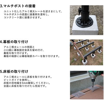 専用の根太レールにマルチポストの台座をスライドさせてビス止めするだけで簡単に下地を作ることができます。