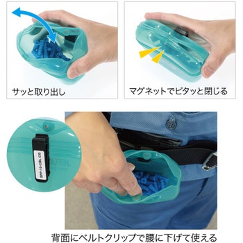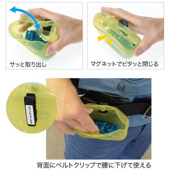 サッと取り出し、ピタッと閉じる小物入れ中に入っているパーツが、ひと目でわかる透明ボディ手を差し込めるやわらか開口部マグネットでピタッと自動で閉じるシリコン製でやわらかく、水に強い背面のベルトクリップで腰に下げて使える油性ボールペンでメモ書き可能&簡単に消せる