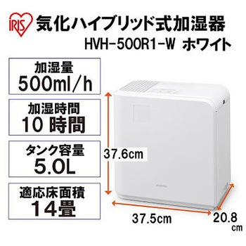 仕様●型番:HVH-500R1●電源:AC100V ●消費電力(50/60Hz):266W●タンク容量:約5L●サイズ:375(W)×208(D)×376(H)mm●重量:5.4kg●電源コード長:約1.5m●適用床面積(50/60Hz):プレハブ洋室/23m2(14畳)、木造和室/14m2(8.5畳)●加湿量:約500ml(ターボモード時)●連続加湿時間:約10時間 ●切タイマー:2・4・6時間設定で自動消灯●運転モード:連続モード3段階(強・中・弱) 自動モード3種類(おやすみ・うるおい・おまかせ)ターボモード、ヒーターオフモード●加湿方式:気化ハイブリッド●静かにやさしく潤うハイブリッド式加湿器アズワン品番65-5664-44内容量1個