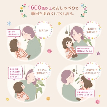 お話し1600通り以上、季節や時間でおしゃべりが変化。早口言葉も多数お話しします。ご利用者様の顔を覚えて名前を呼んでくれる「お顔認識機能」搭載!ご利用者様を気遣うお話しや時折甘えたり。質問も様々なお話しをします。早口言葉35種、童謡・唱歌を40曲収録しているので、会話以外でのコミュニケーションも楽しめます。ヘアアレンジ可能なさらさらヘア。目を閉じたりまばたきもします。