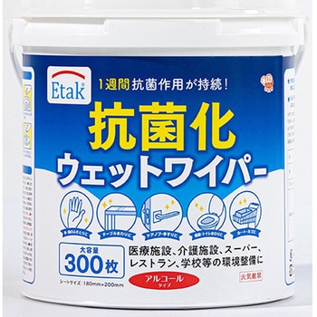 特許成分Etakが拭いた物の表面に固定化されるため、抗菌作用が1週間持続します。アルコール配合なので拭くだけで簡単に汚れも菌も除去します。手・指の汚れ落としにも使えます。たっぷり使える大容量300枚入。乾燥しにくいバケツ容器入り。