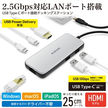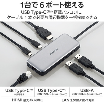 色シルバー備考※各OSの最新バージョンへのアップデートや、サービスパックのインストールが必要になる場合があります。対応OSWindows 11/Windows 10、macOS Sonoma 14/macOS Ventura 13、iPadOS 17/iPadOS 16 ※iPadを充電する際は、45W以上のUSB Power Delivery対応ACアダプターをご使用ください。外形寸法(幅W×奥行D×高さH)(mm)約120×50×16 ※ケーブル含まず動作環境温度5~40℃、湿度30~80% ※結露なきこと保証期間1年間電源供給方式バスパワーケーブル長(cm)約25※コネクター含まずUSBポート数【ダウンストリーム】1:USB Type-C(TM)<USB>×1 ※データ通信専用、映像出力には対応していません、【ダウンストリーム】2:USB Type-C(TM)×1<最大出力85W> ※充電専用USB Power Deliveryポート、【ダウンストリーム】3:USB Standard-A<USB>×2・供給電力値:1ポートは7.5W(5V/1,5A)・残り1ポートは4.5W(5V/0.9A)・2ポート合計 10W(5V/2A)コネクタ仕様【アップストリーム】USB Type-C(TM)<USB>、USB Power Delivery対応(最大入力100W / 最大出力85W)、DisplayPort(TM) Alt mode (USB2.0接続時は、USB2.0互換で動作(USB2.0時は、映像出力非対応))ポート【映像出力/ダウンストリーム】HDMI×1<対応解像度:最大4K/60Hz>LAN【ポート(ダウンストリーム)】RJ-45(2.5GBASE-T/1000BASE-T/100BASE-TX/10BASE-T)内容量1個