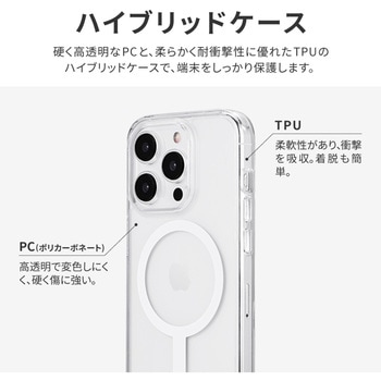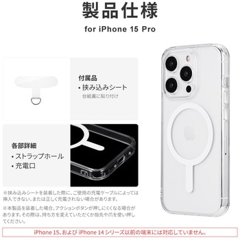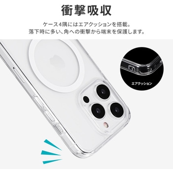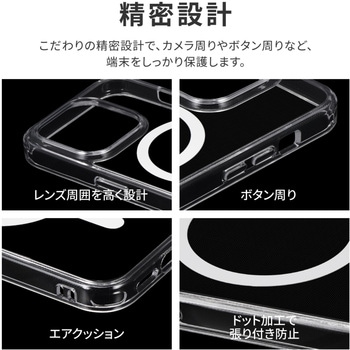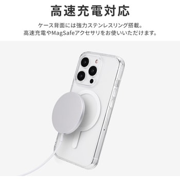【耐衝撃】 高速充電対応・MagSafeアクセサリが使える強力ステンレスリング搭載/高透明なポリカーボネートと、柔らかく耐衝撃性に優れたTPUのハイブリッドケース/角に衝撃を吸収するエアクッションを搭載/柔軟性があり着脱が簡単/ボタンやカメラレンズを保護する精密設計/マイクロドット加工で端末に張り付きにくい/ストラップホール搭載/ショルダーストラップの取り付けに最適な「挟み込みシート」付属