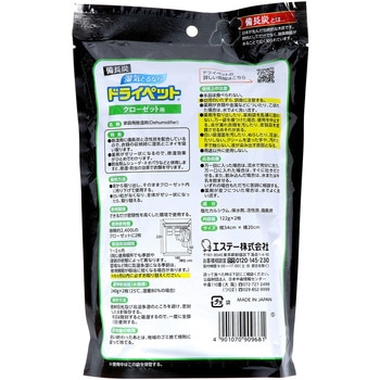 用途●袋から取り出し、そのままクローゼット内に吊り下げて使用する。●白い粒がなくなり、全体がゼリー状になったら、取り替える。【使用環境】できるだけ密閉性を高くした環境で使用する。【標準使用量】容積約2,400Lのクローゼットに2枚180cm×220cm×60cm【除湿有効期間】1~2ヵ月(同じ使用場所でも季節や湿気の状態によって異なります。夏場など特に高温多湿になる季節は、使用期間が極端に短くなる場合があります。)※6ヵ月以内に必ずお取り替えください。【標準除湿量(水換算)】240g×2枚(25℃、湿度80%の場合)【保存方法】直射日光及び高温多湿のところを避け、密封したまま保存する。本品は開封すると吸湿するので、一度に全部(2枚)使用する。【使用後の処理】使い終わったあとは、地域のゴミ捨て規則に従って捨てる。