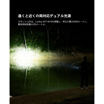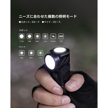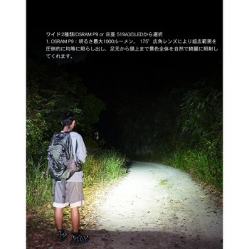 同時点灯可能「スポット」「ワイド」のデュアル光源・180度回転ヘッド明るさ最大2000ルーメン・最大照射距離350メートルスポット6モード、ワイド3モード米国Luminous SST40-W × 1個&独OSRAM P9 × 1個搭載モバイルバッテリーとして使用可能両手が使える懐中電灯Type-C充電式(5V2A)付属部品 ・Type-C充電、給電ケーブル × 1本・防水パッキン(スペア)・ストラップ・ポーチ