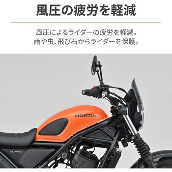 快適にツーリング&街乗りを。耐衝撃性を誇るポリカーボネート製だから、まさかの転倒時でも安心。エアロバイザー取り付けを皿ビスにすることで、質感を向上させました。社外ウインカー装着用サービスホール(Φ8)付き。お好きなウインカーにカスタムできます。【適合車種】CL250(23)CL500(23)・カラー:スモーク