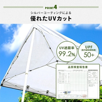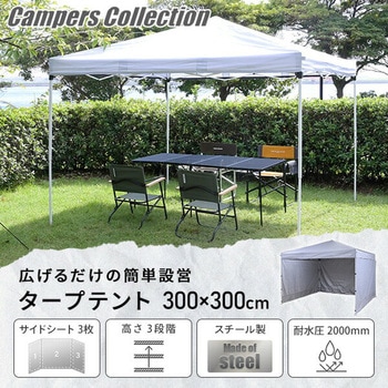 広げるだけの簡単設営 ワンタッチタープテント。サイドシート3枚付き。フレームは丈夫なスチール製。
