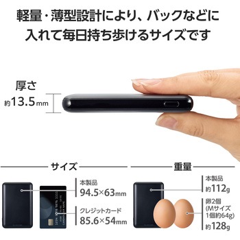小さなバッグやポケットに入れても気にならない、薄型・コンパクトタイプのモバイルバッテリーです。約112gと軽量ながら容量は5000mAh。持ち運びにちょうどいいサイズです。