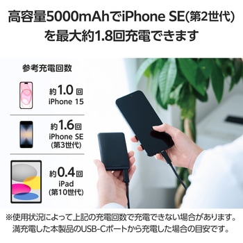 本製品(バッテリー容量5000mAh)で、1800mAhのスマートフォンを約1.8回、3000mAhのスマートフォンを約1.1回充電可能です。