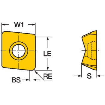 チタン合金加工用ロングエッジカッターのチップです。iLockインターフェイスにより、非常に高いチップクランプ剛性です。全チップ内部クーラント対応のカッター。高圧クーラントも適用可能で、長い工具寿命を実現しました。外周刃は4コーナー仕様チップ、90°の切れ刃は安全長寿命で工具コスト削減が出来ます。