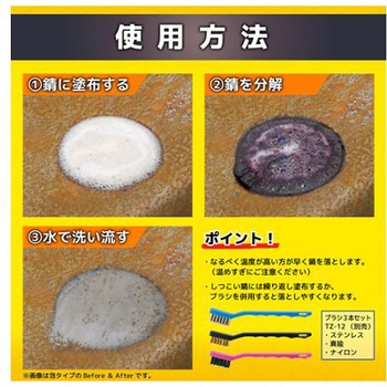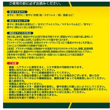 【注意事項】 ※シミや変色の可能性がありますので、事前に目立たない部分でお試しください。 ※除錆後は水で流し、防錆処理を行ってください。 ※強い力が加わるバネ、チェーン、ボルトなどの機械部品は、除錆後に再使用しないでください。