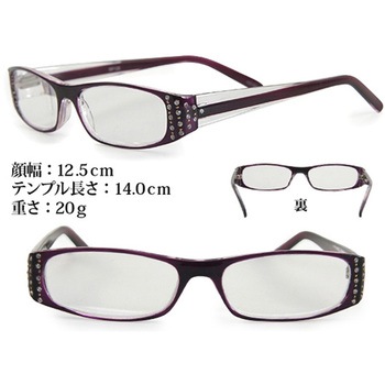 ●顔幅:12.5cm●テンプル長さ:14cm●レンズサイズ:2.5cm●重さ:20g●度数:+3.00●材質:レンズ/アクリル、フレーム・テンプル/セルロースアセテート、チップ/ポリカーボネイド●付属品:専用メガネケース